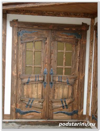 Двери деревянные из искусственно состаренного дерева с элементами художественной ковки. Wooden doors of artificially aged wood with elements of artistic forging.